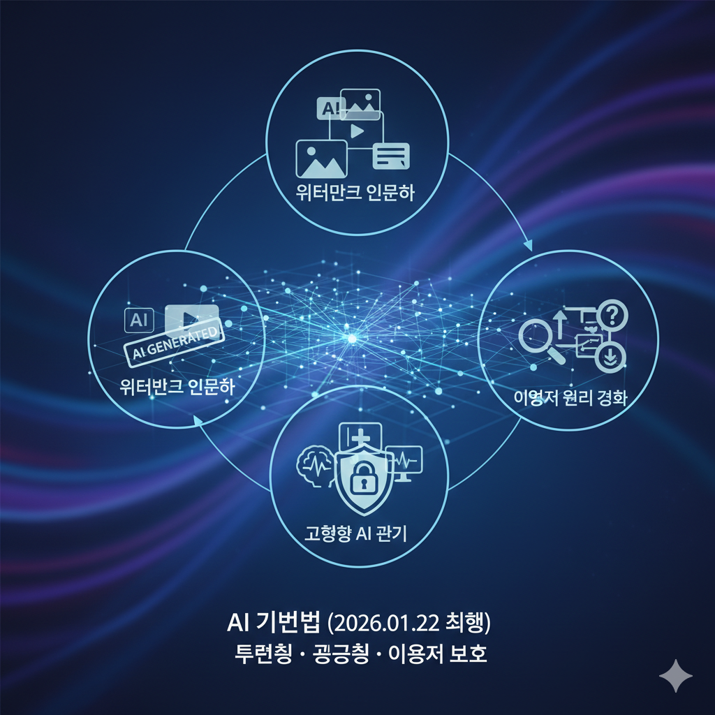 - AI 기본법: 2026년 1월 22일 시행, AI 산업 진흥과 신뢰 확보가 목적.