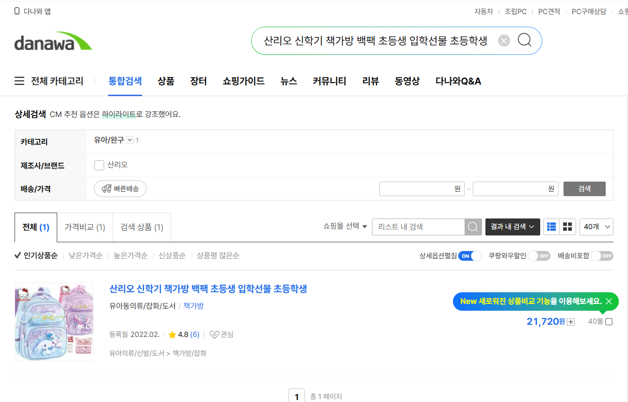 '초등학생 책가방'의 다나와 통합검색 결과입니다.
