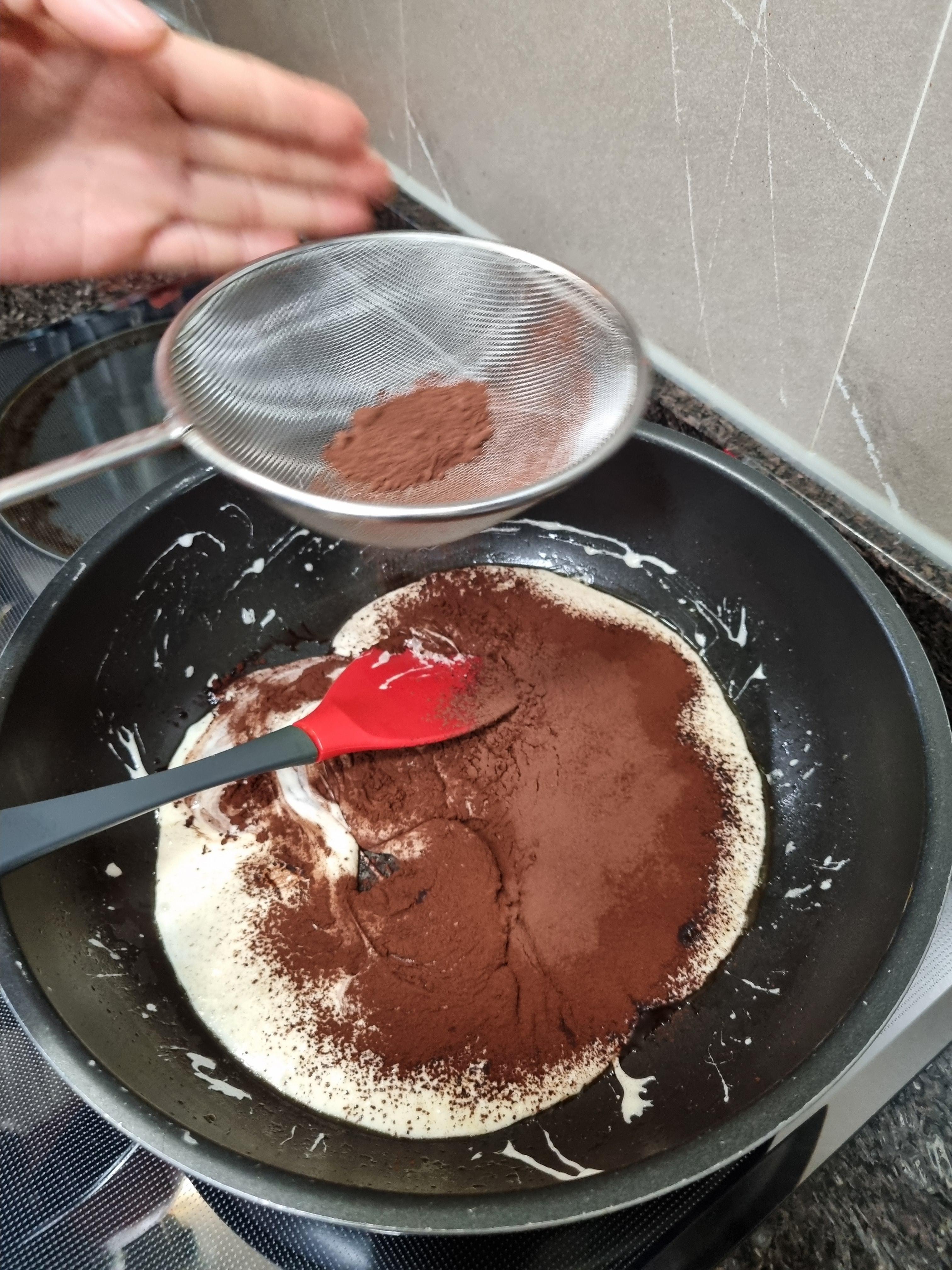 4. 마시멜로가 부드럽게 녹으면 코코아가루를 넣어 섞어줍니다.