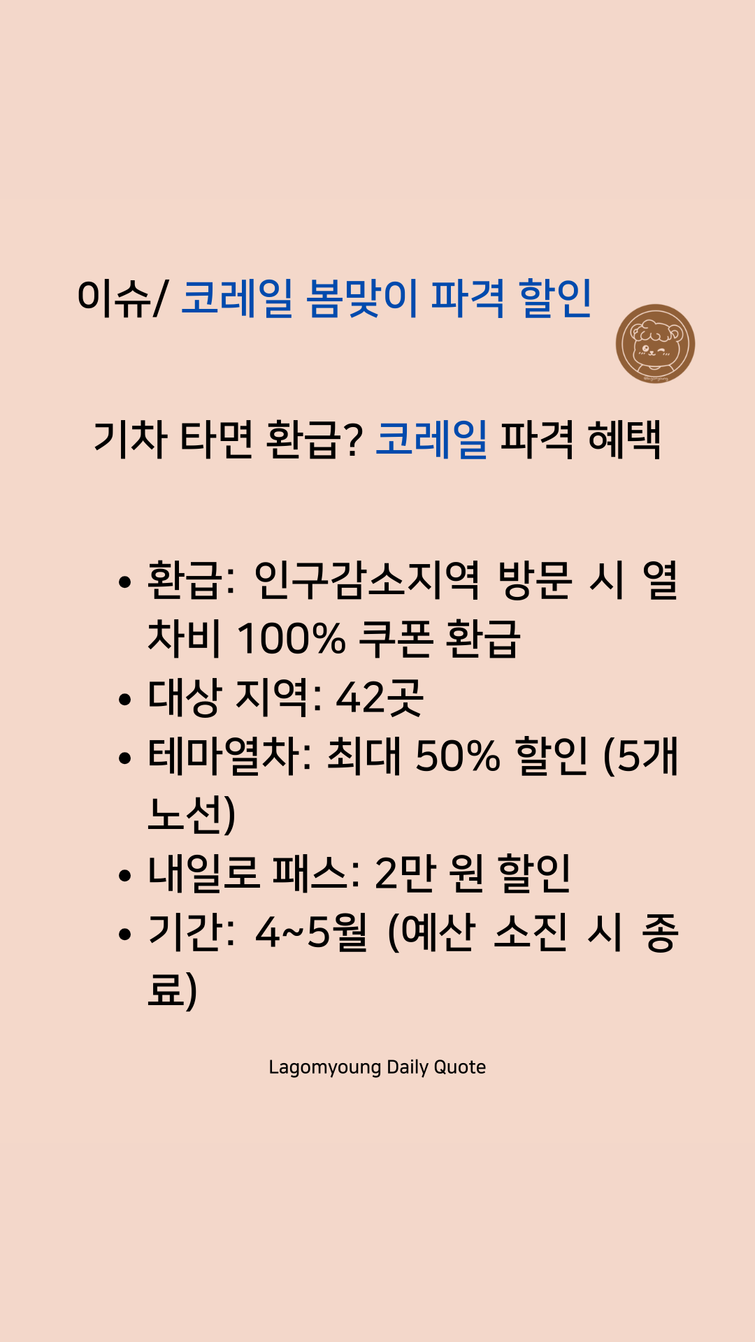우리 부부처럼 여행을 즐기는 분들에겐 놓칠 수 없는 기회입니다. 소멸해가는 지방 소도시도 살리고, 우리는 가벼운 지갑으로 인생 사진을 남길 수 있는 상생의 기회죠. 4월과 5월 두 달간 진행되니, 지금 바로 '코레일톡' 앱을 열어보세요! 예산 소진 시 조기 마감될 수 있다는 점, 꼭 기억하세요!
