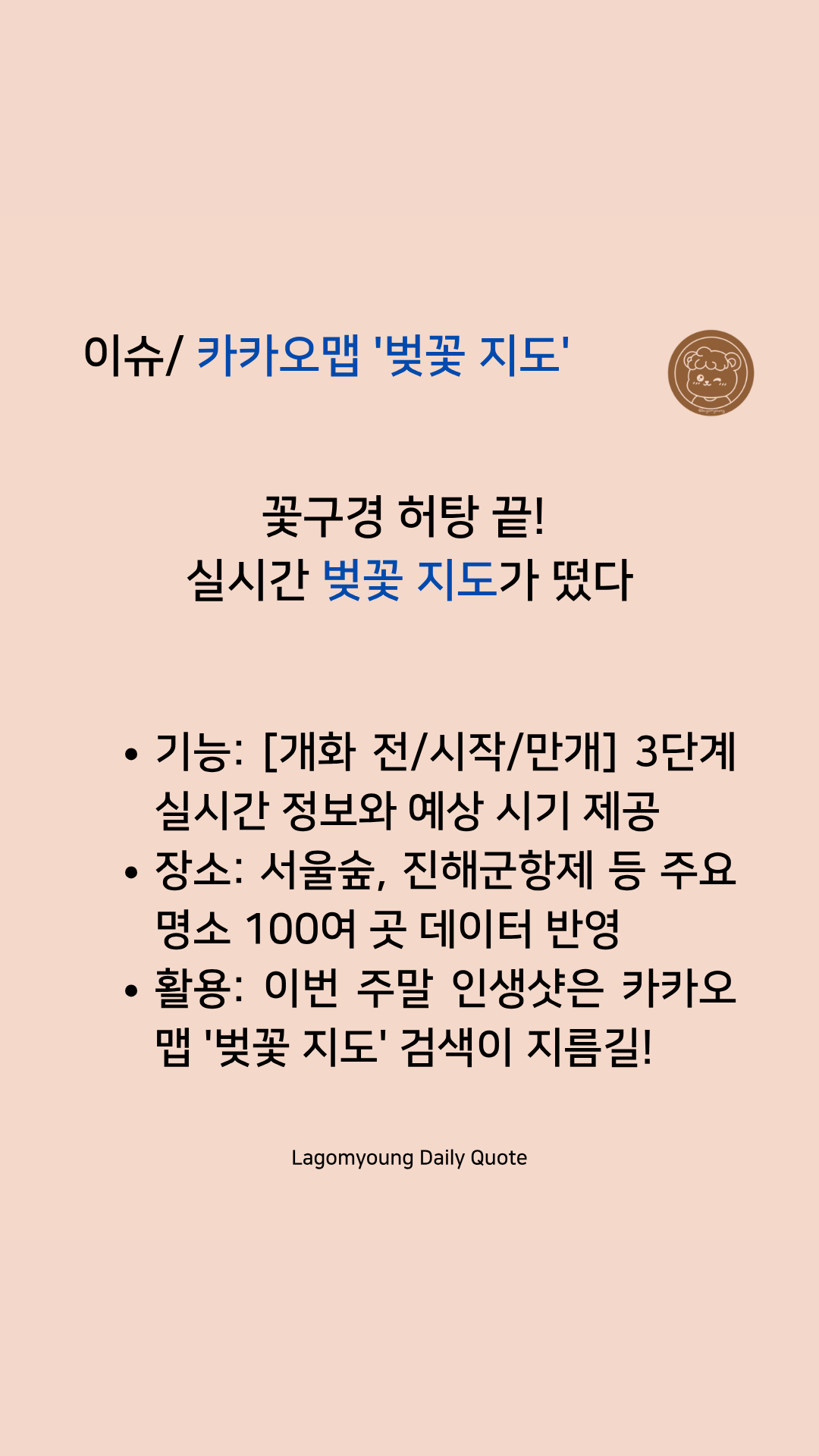 • [이슈] 카카오맵 '벚꽃 지도' 출시: 데이터가 단순한 숫자를 넘어 우리의 여가와 감성까지 케어하는 '라이프 플랫폼'의 시대를 증명하고 있습니다.