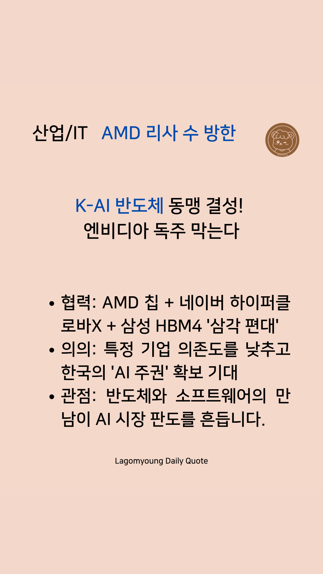 • [IT/산업] AMD 리사 수의 K-반도체 회동: 기술 패권 전쟁 속에서 삼성과 네이버 같은 국내 기업들이 단순한 제조사를 넘어 글로벌 AI 생태계의 '핵심 파트너'로 급부상하고 있습니다.