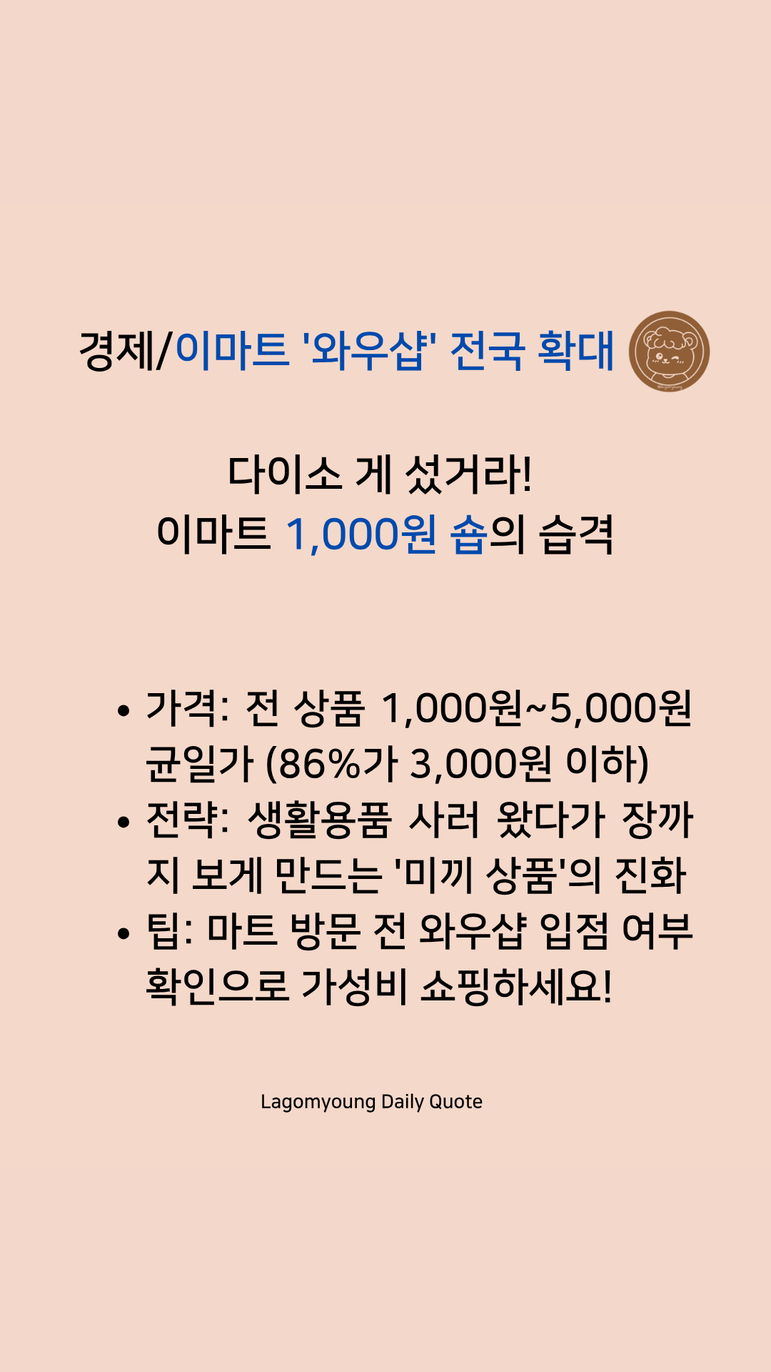 • [경제] 이마트 '와우샵' 전국 확대: 거대 유통 기업도 '1,000원 마케팅'에 뛰어들 만큼 고물가 장기화에 대한 위기감과 실속 소비 트렌드가 강력해졌음을 보여줍니다.
