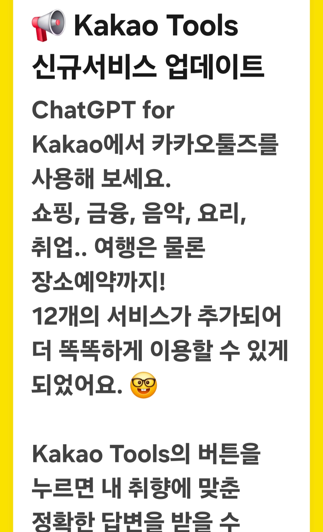 기존의 카카오툴즈가 단순히 카카오 내부 기능들을 보조하는 정도였다면, 이번 업데이트는 차원이 다릅니다. 외부의 쟁쟁한 파트너사들과 손을 잡고, 진정한 의미의 '나만의 AI 비서'로 확장되었거든요. 제가 직접 써보고 느낀 생생한 경험과 함께, 이번 업데이트의 핵심을 자세히 작성해 봅니다.