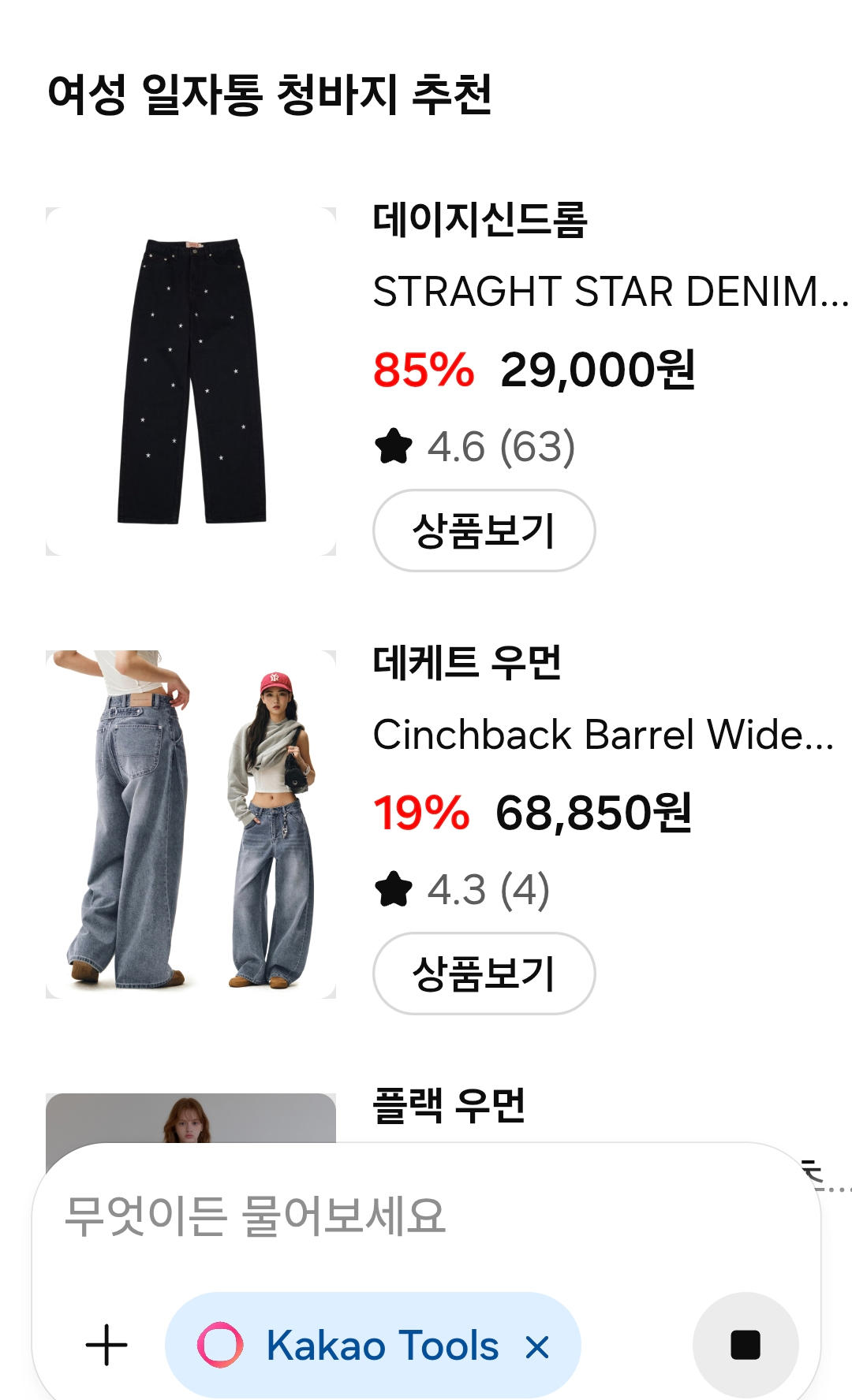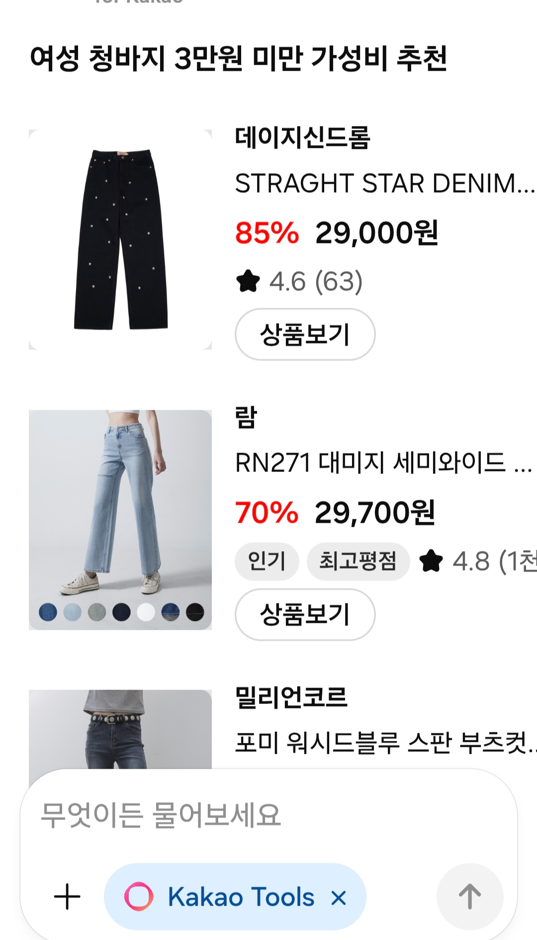 "편하게 입을 수 있는 일자핏 청바지, 5만 원대로 찾아줘."