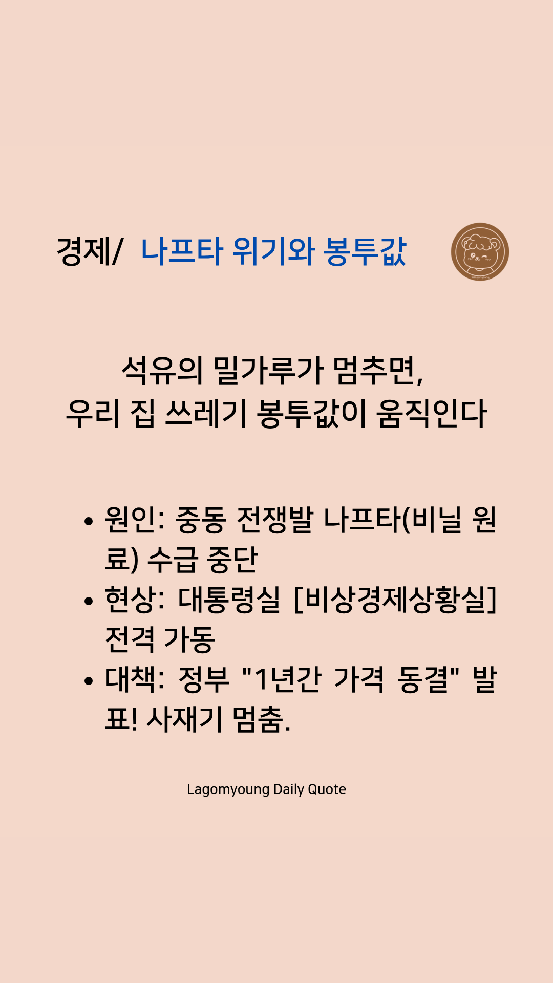 • 라곰영의 해석: 대통령실(청와대)은 이 사안을 엄중히 보고 [비상경제상황실]을 신설·가동하며 원자재 수급 대책을 쏟아내고 있습니다. 원자재가 흔들리면 결국 내 집 앞 쓰레기 봉투값까지 오른다는 사실, 이제 '자원 미니멀리즘'은 선택이 아닌 생존 전략입니다.