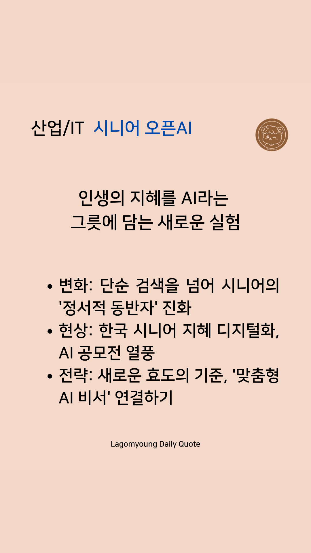 • 라곰영의 해석: "부모님께 어떤 AI를 연결해 드릴까"가 새로운 효도의 기준이 될 것입니다. 나이는 숫자가 아닌 가장 귀한 데이터입니다. 기술에 마음을 여는 시니어의 모습에서 우리도 '평생 학습'의 자세를 배워야 합니다.