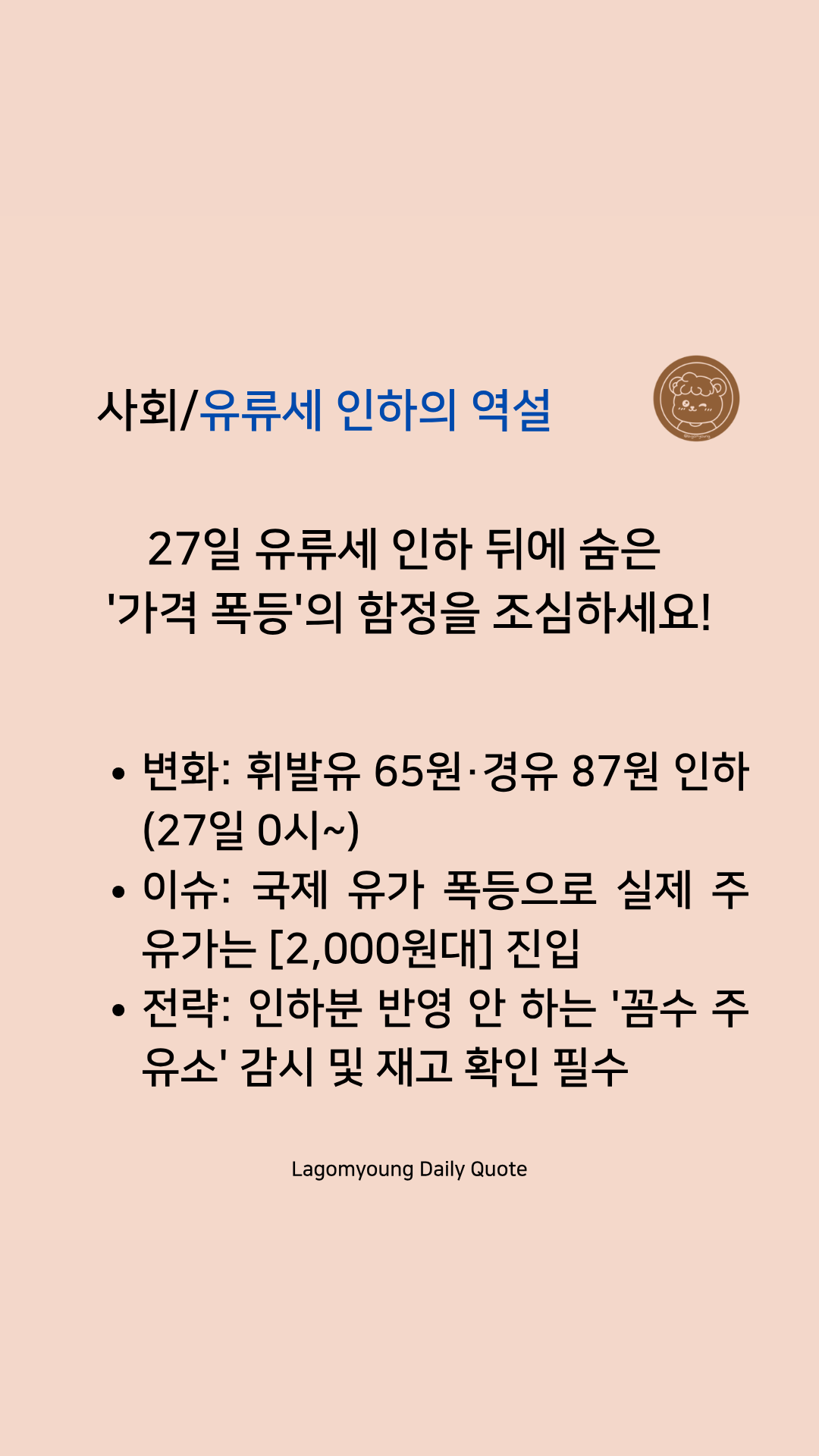 라곰영의 해석: "지금 넣을까, 내일 넣을까"의 문제가 아니라, "어떤 주유소가 재고를 핑계로 가격을 폭등시키나"를 감시해야 하는 시점입니다. 정부도 저렴하게 매입한 재고가 있는데도 즉시 가격을 올리는 주유소를 엄격히 주시하겠다고 밝혔습니다. 정보의 시차가 곧 돈의 차이가 되는 시대입니다.
