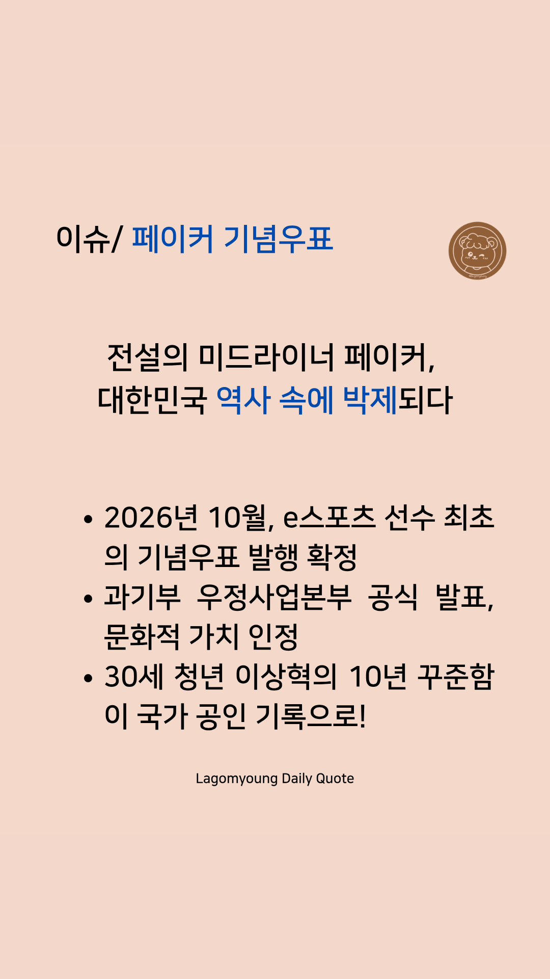 • 라곰영의 통찰: 서른 살의 나이, 프로게이머로서는 황혼기라 불릴 법한 시기에도 정상을 지키는 페이커 선수의 힘은 '꾸준함'입니다. 국가가 발행하는 우표는 그 꾸준함이 한 개인의 영광을 넘어 시대의 자부심이 되었음을 상징합니다.