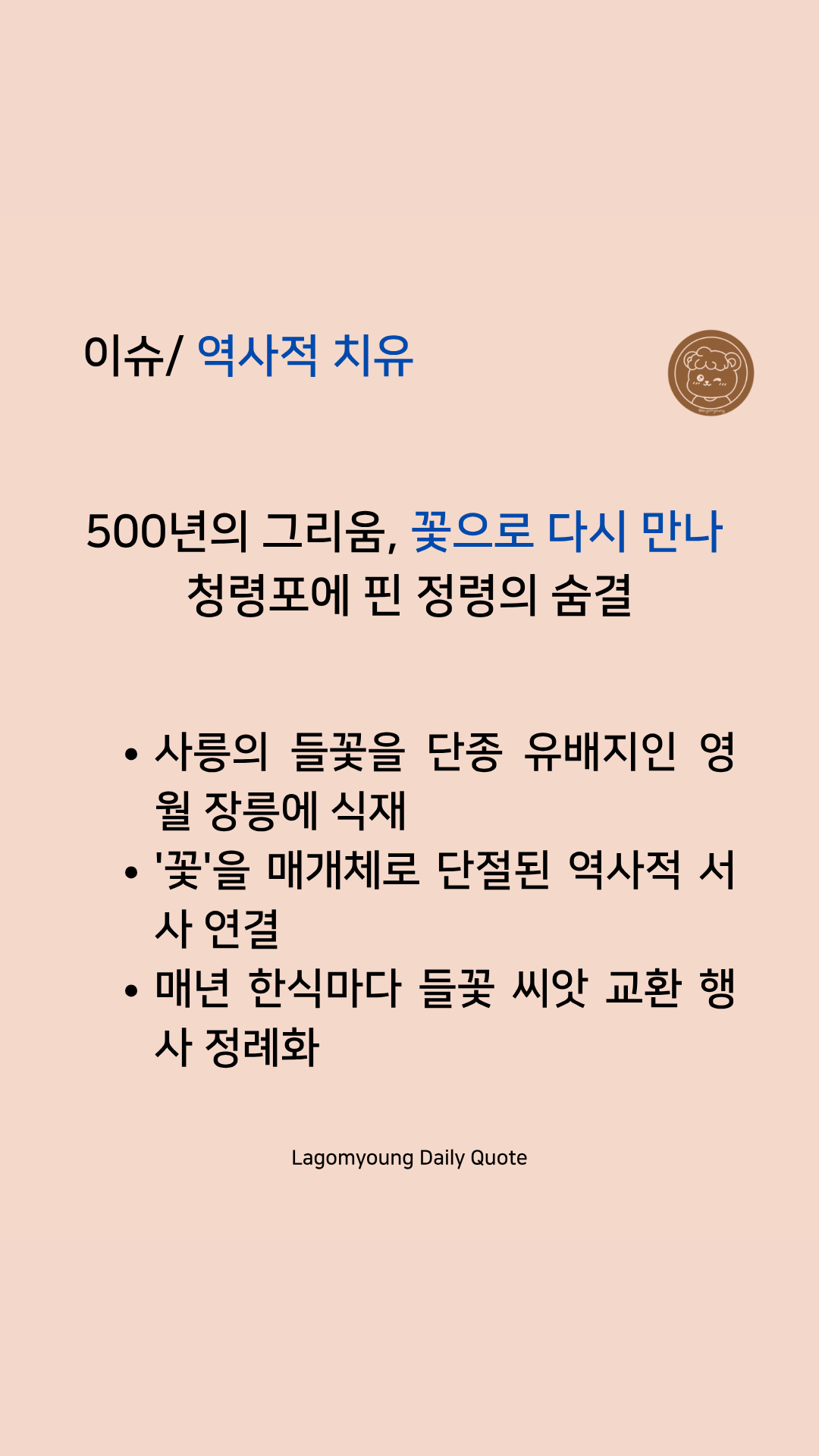 - 라곰영의 시선: 321단의 높은 반도체가 우리의 '미래'라면, 이 500년의 그리움을 잇는 꽃 한 송이는 우리의 '뿌리'입니다. 효율만 따지다 잃어버린 마음의 여유를, 씨앗을 채취해 이듬해 다시 정성껏 심어 올리는 장릉의 뜰에서 되찾아봅니다.
