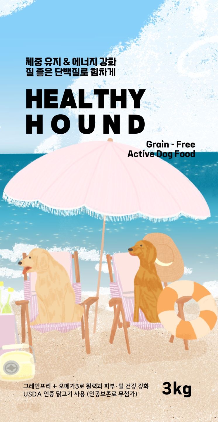 이 일러스트를 기반으로 가상의 사료 브랜드 ‘HEALTHY HOUND’ 패키지 시안을 제작해 보았습니다.