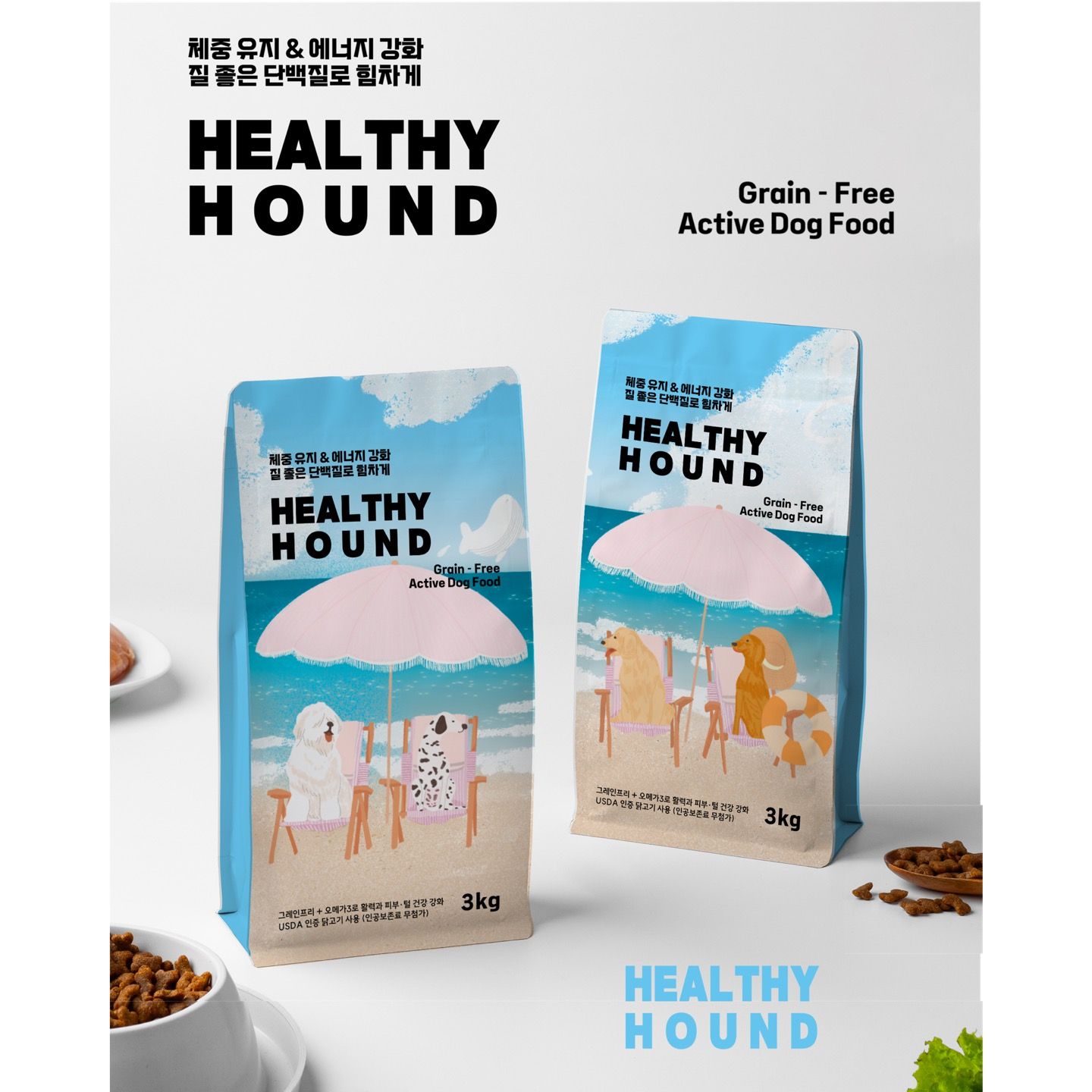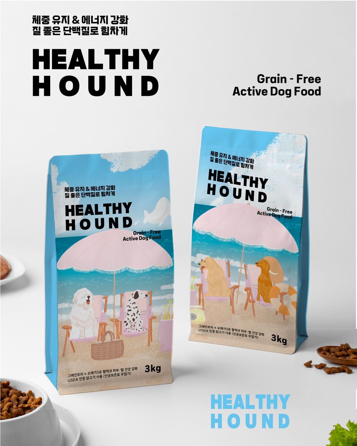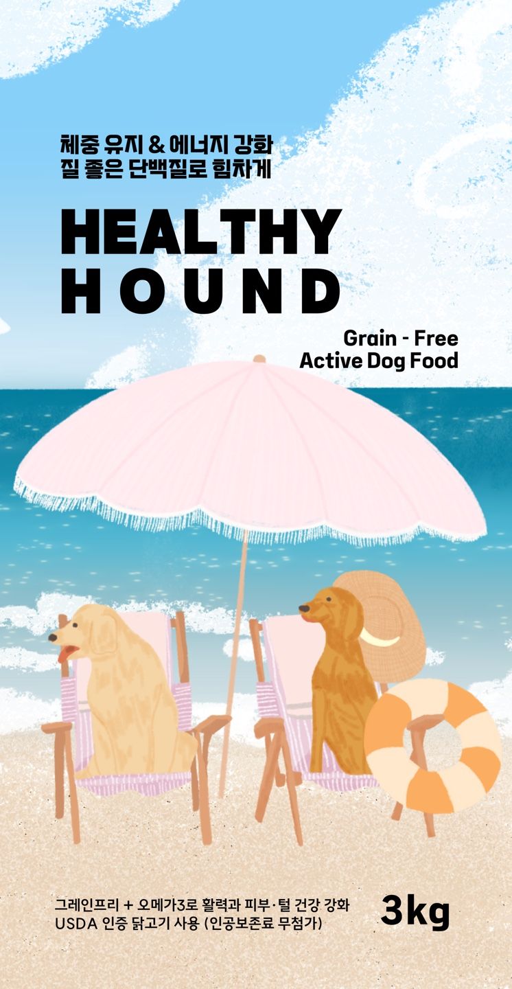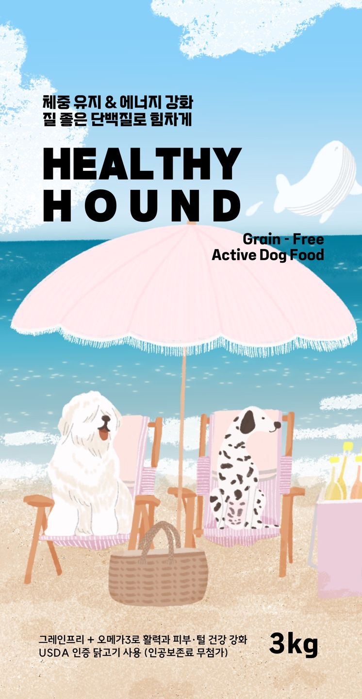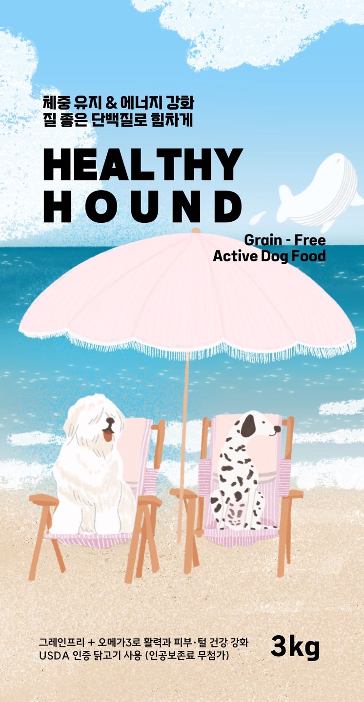 이 일러스트를 기반으로 가상의 사료 브랜드 ‘HEALTHY HOUND’ 패키지 시안을 제작해 보았습니다.