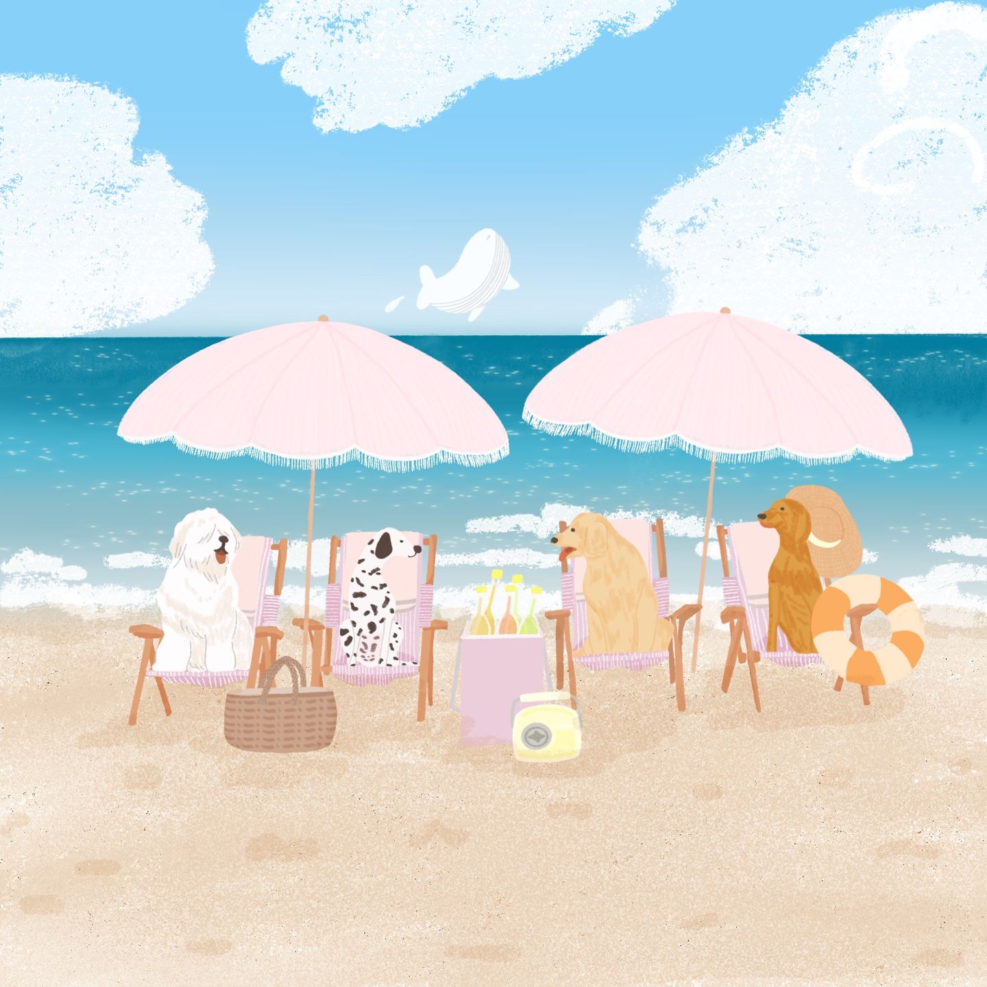 휴가를 주제로 한 배경, 바닷가, 그리고 의인화된 강아지들의 여유로운 모습이 그려진 이 일러스트는, 단순한 그림을 넘어 하나의 브랜드 메시지를 담은 이미지로 구성하려 노력했습니다.